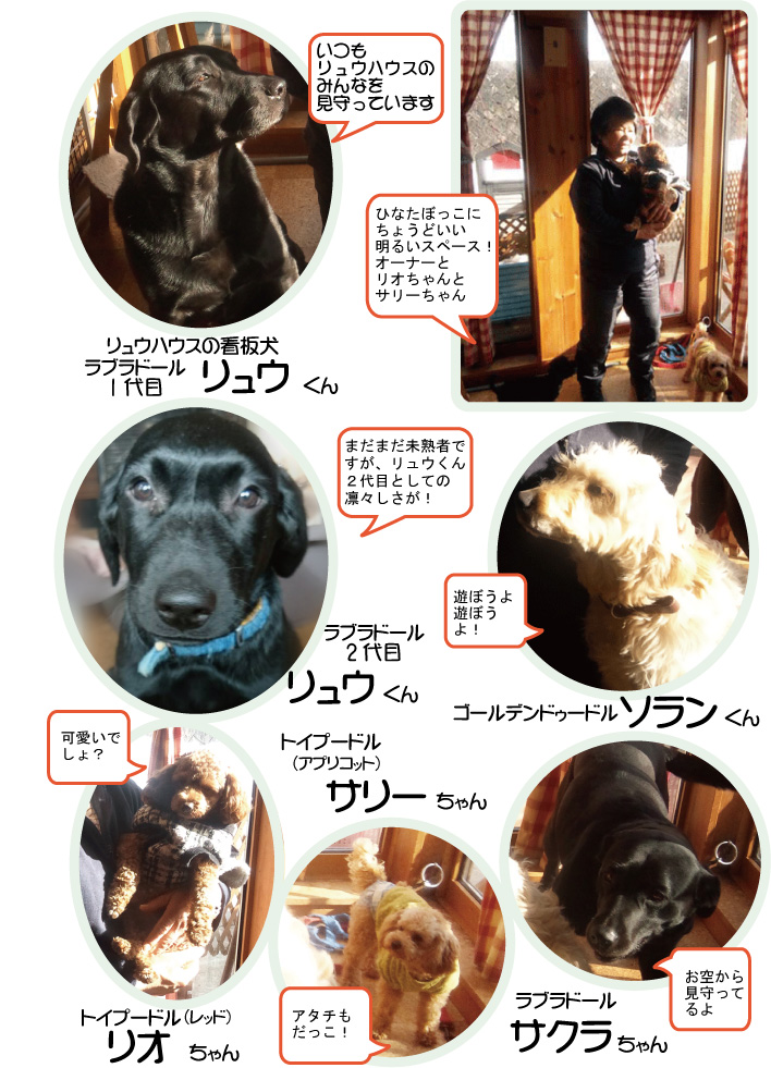 リュウハウスの看板犬、ラブラドールのリュウくんは13歳と10カ月で他界しましたが、今もリュウハウスのみんなを見守っています。 2代目リュウくんは先代に負けない立派な看板犬になるべくすくすく育っています。 サクラちゃんはじめ、ゴールデンドゥードルのソランくん、トイプードルのリオちゃん、サリーちゃんたちが大歓迎します! ワンちゃんの足にやさしいコルクの床や、ログハウス風の造り、何より明るい姉御肌のオーナーのもと、ワンちゃんたちはナチュラルに育っています。